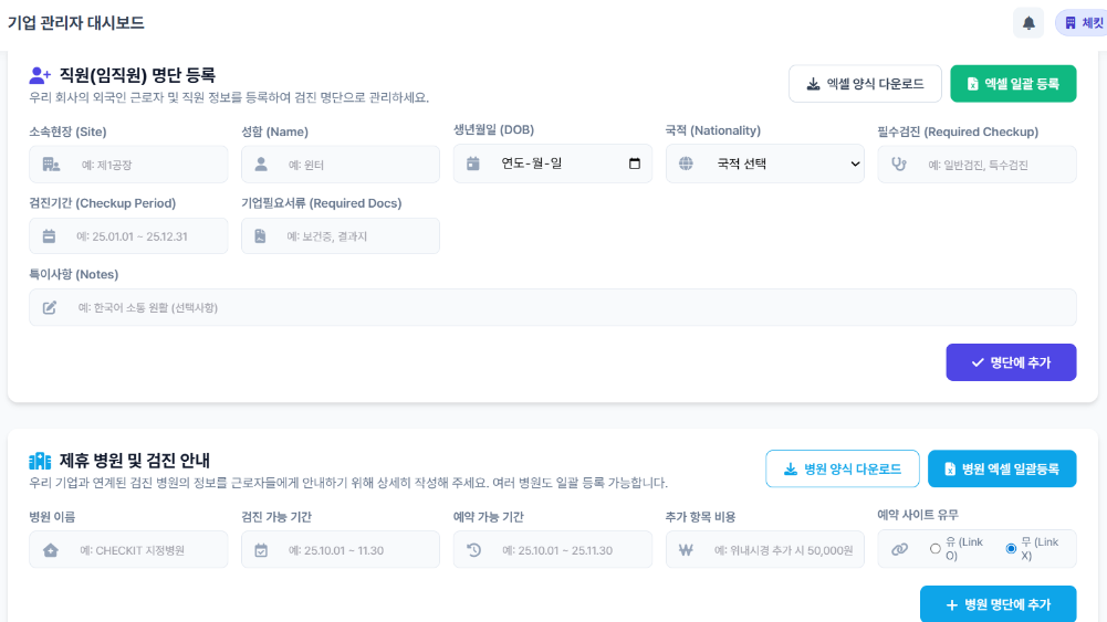 근로자 명단 & 병원 정보 원스텝 등록