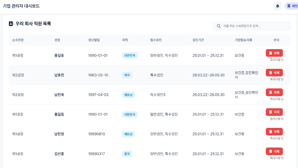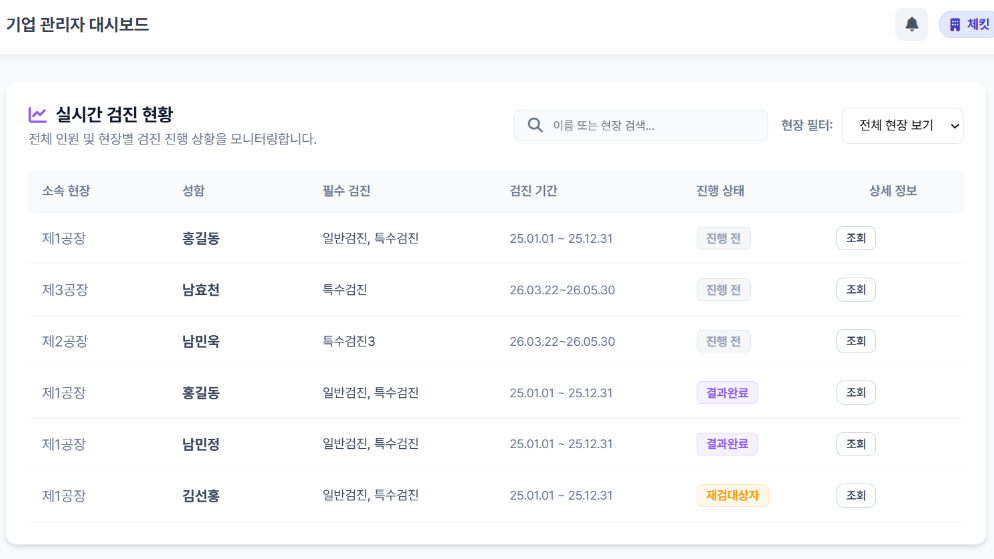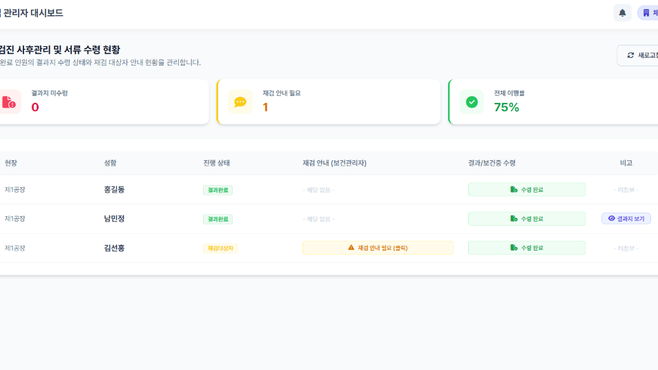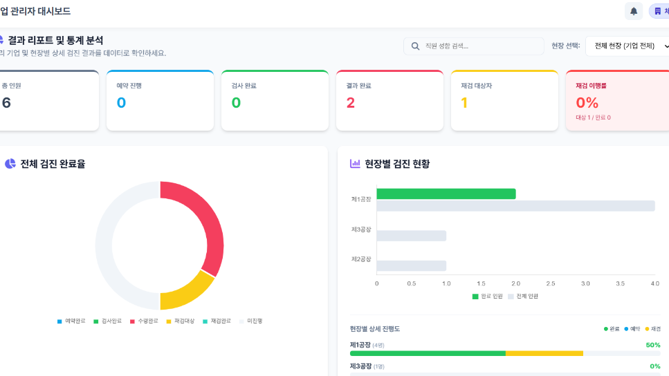 현장별 검진 현황, 참여율, 재검률 등 핵심 지표를 시각화된 데이터로 제공하며,보건관리 사후 관리 단계까지 한눈에 실시간 모니터링이 가능합니다.
