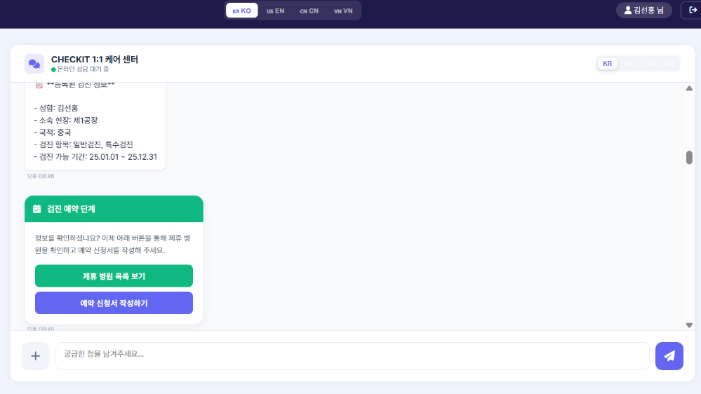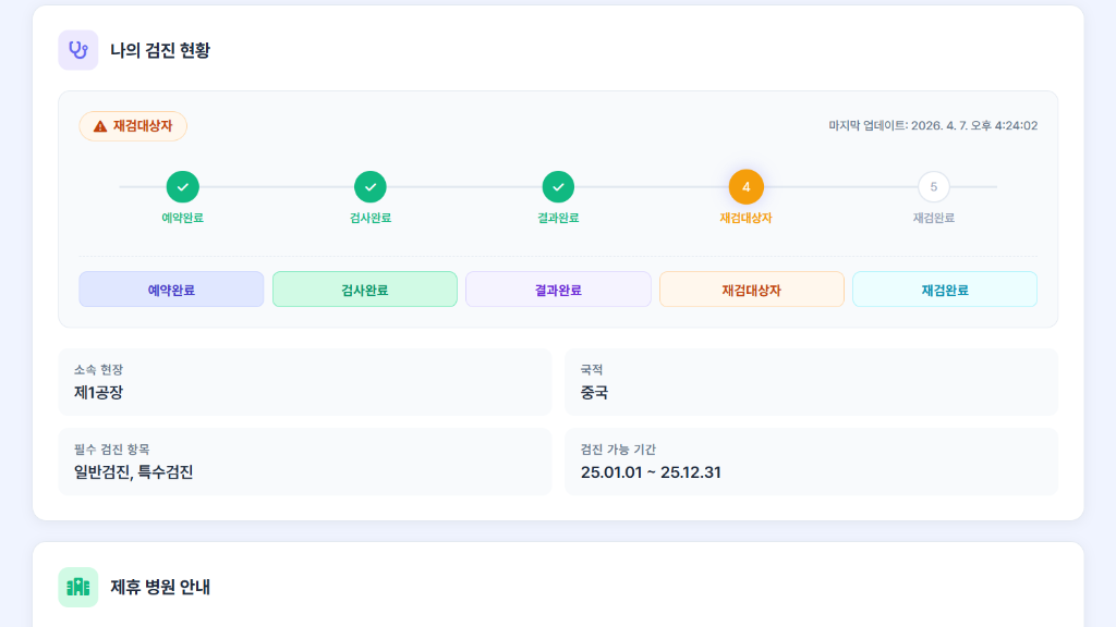 근로자는 개인 포털에서 모국어로 검진 정보를 직접 확인하고 관리하며,관리자에게 문의할 필요 없이 스스로 검진 여정을 순조롭게 이행합니다.