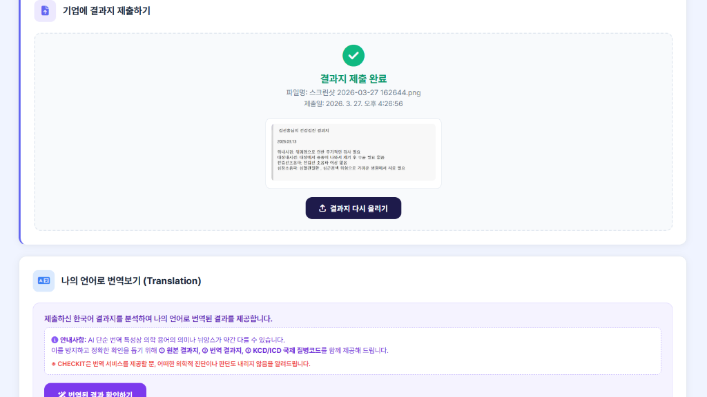 한국어 결과지를 업로드하면 모국어 번역 결과와 국제 질병코드가 함께 제공되어,외국인 근로자도 본인의 건강 상태를 정확하고 투명하게 이해할 수 있습니다.
