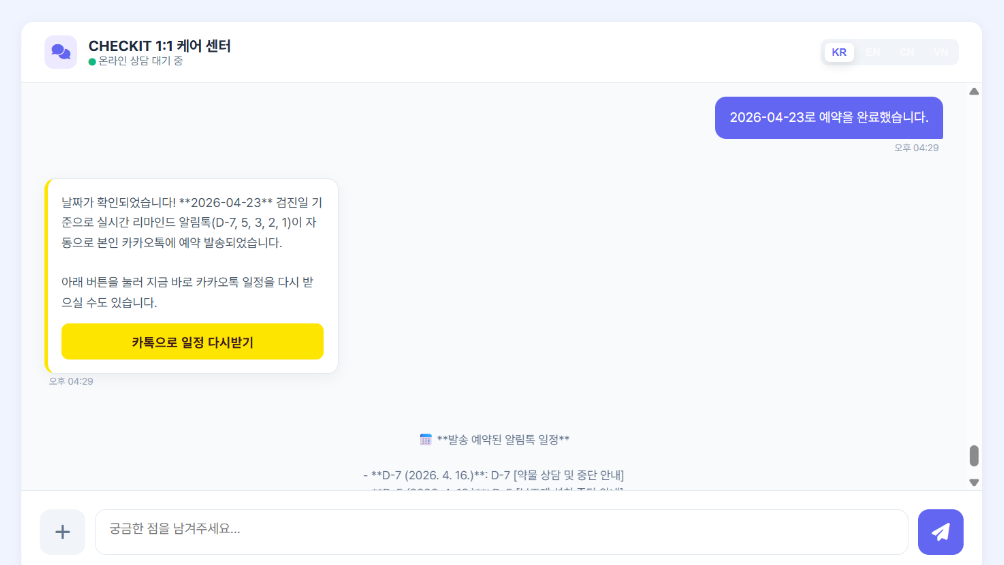 내원 일정에 맞춰 발송되는 단계별 예약 리마인더 시스템으로,검사 누락과 노쇼를 사전에 방지하여 기업 보건관리를 막힘없이 지원합니다.